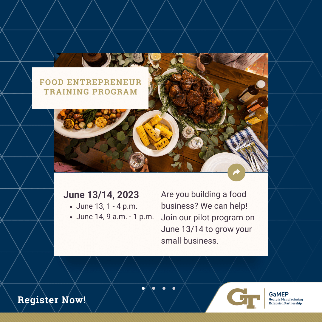 Led by Georgia Tech’s Enterprise Innovation Institute, this two-day free training program is for food and farmer entrepreneurs looking to scale up their operations from their home to a commercial kitchen. The course will cover how to get a food license in Georgia, the difference between Cottage Food and Food Sales Establishments Licenses, tips for starting a food company, and complying with FDA, FSMA, and USDA regulations.