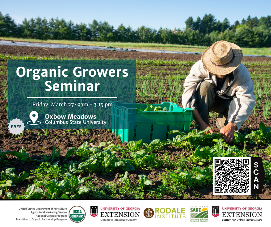 Rodale Institute, the University of Georgia Center for Urban Agriculture, and UGA Extension Muscogee County will partner to host the Organic Growers Seminar on Friday, March 27th in Columbus, Georgia from 9:00 AM–3:15 PM. This free, in-person seminar is designed for current and transitioning small-scale organic growers and will be capped at 50 participants.